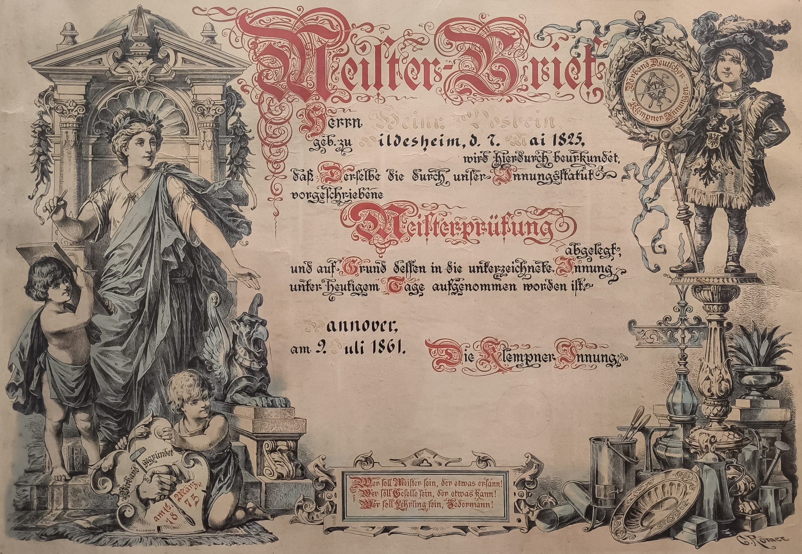 Meisterbrief der Handwerkskammer von Hannover aus dem Jahre 1861 ausgestellt für Herrn Heinz Vosbein.
