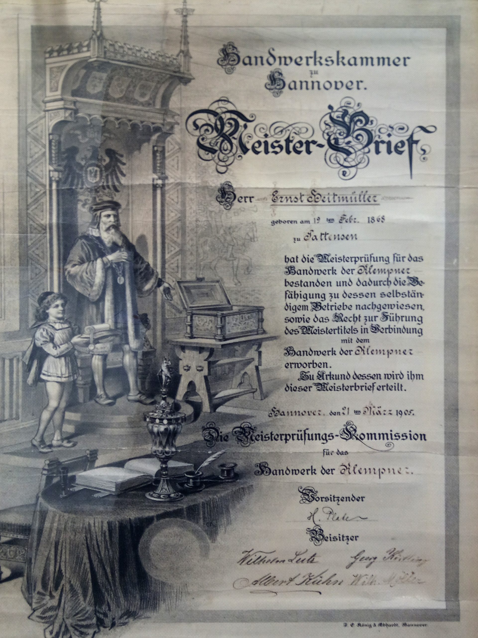 Meisterbrief der Handwerkskammer von Hannover aus dem Jahre 1905 ausgestellt für Herrn Ernst Heitmüller.